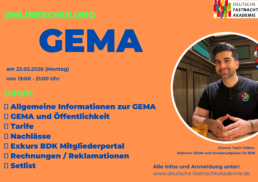 In der Schulung werden grundlegende Informationen zur GEMA vermittelt. Darüber hinaus wird erläutert, welche Rolle die Öffentlichkeit bei Veranstaltungen spielt und welche Tarife und möglichen Nachlässe relevant sind. Ein weiterer Bestandteil der Veranstaltung ist ein Einblick in das BDK-Mitgliederportal. Außerdem werden Themen wie Rechnungen, Reklamationen sowie die Bedeutung von Setlists behandelt.