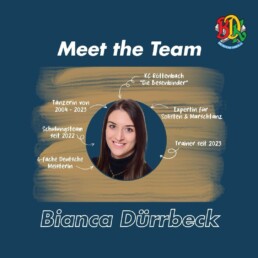 Bianca Dürrbeck war von 2004 bis 2023 als aktive Tänzerin im karnevalistischen Tanzsport tätig und konnte in dieser Zeit unter anderem sechs Deutsche Meistertitel erringen. Seit 2022 ist sie Mitglied des Schulungsteams und seit 2023 zudem als Trainerin aktiv.