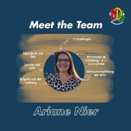 Ariane Nier ist seit 1984 im Tanzsport aktiv und seit 2005 als Jurorin tätig. Als Referentin im Schulungs- und C-Lizenzteam des SV Knielingen legt sie besonderen Wert auf eine respektvolle und wertschätzende Wissensvermittlung. Der bewusste Umgang mit Leistung und Entwicklung steht dabei stets im Mittelpunkt ihrer Arbeit.
